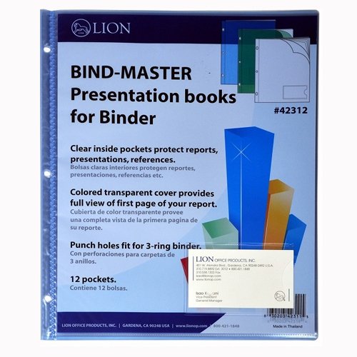 12 clear inside pockets protect reports, presentations, references. Colored view cover. Business card pocket on front cover. Letter Size.Lion Office 42312BL Bind-Master Presentation Book For 3-Ring Binder, Letter Size, 36 Per Box, Blue Specifications